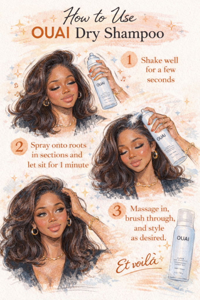 - Apply OUAI or Crown Affair dry shampoo sparingly at the roots (if using the OUAI spray, hold it 5–6 inches away).